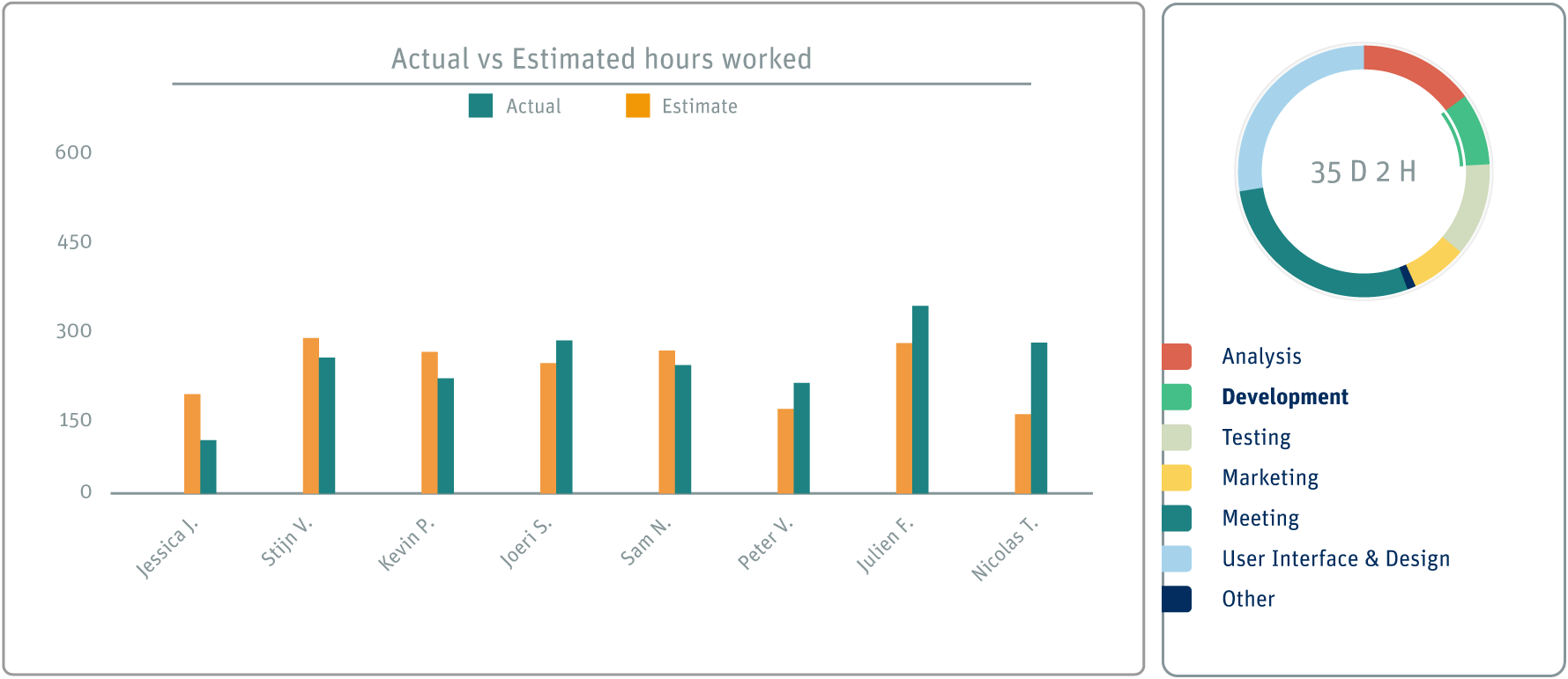 Timetag gives you a quick overview on the criteria of your choice, from comparisons of estimated time with actual time spent on a design project to insights on which employee worked the most in the marketing category.